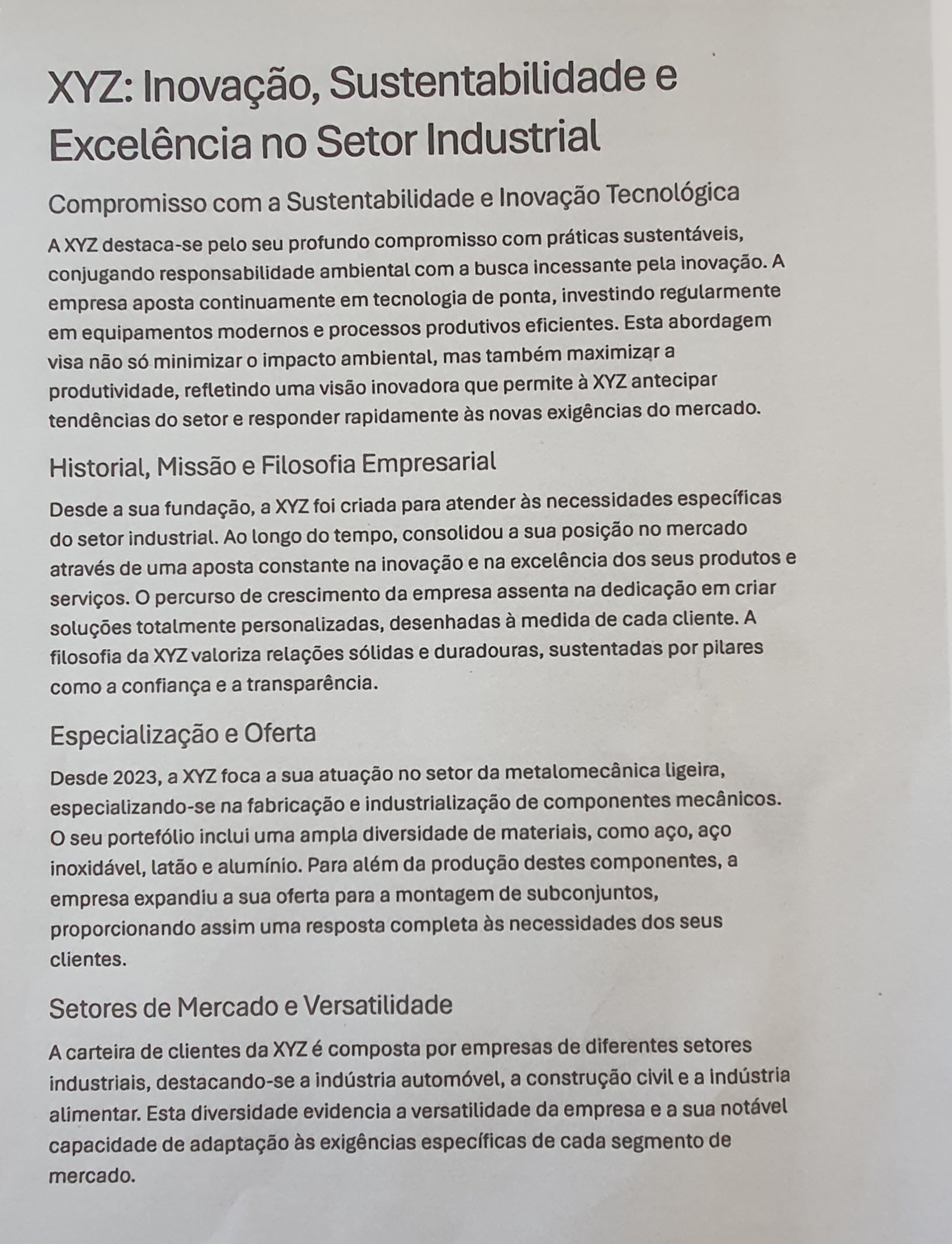 A XYZ é uma empresa recentemente fundada, no ano de 2023, tendo como seu principal foco a fabricação de componentes para a industria.